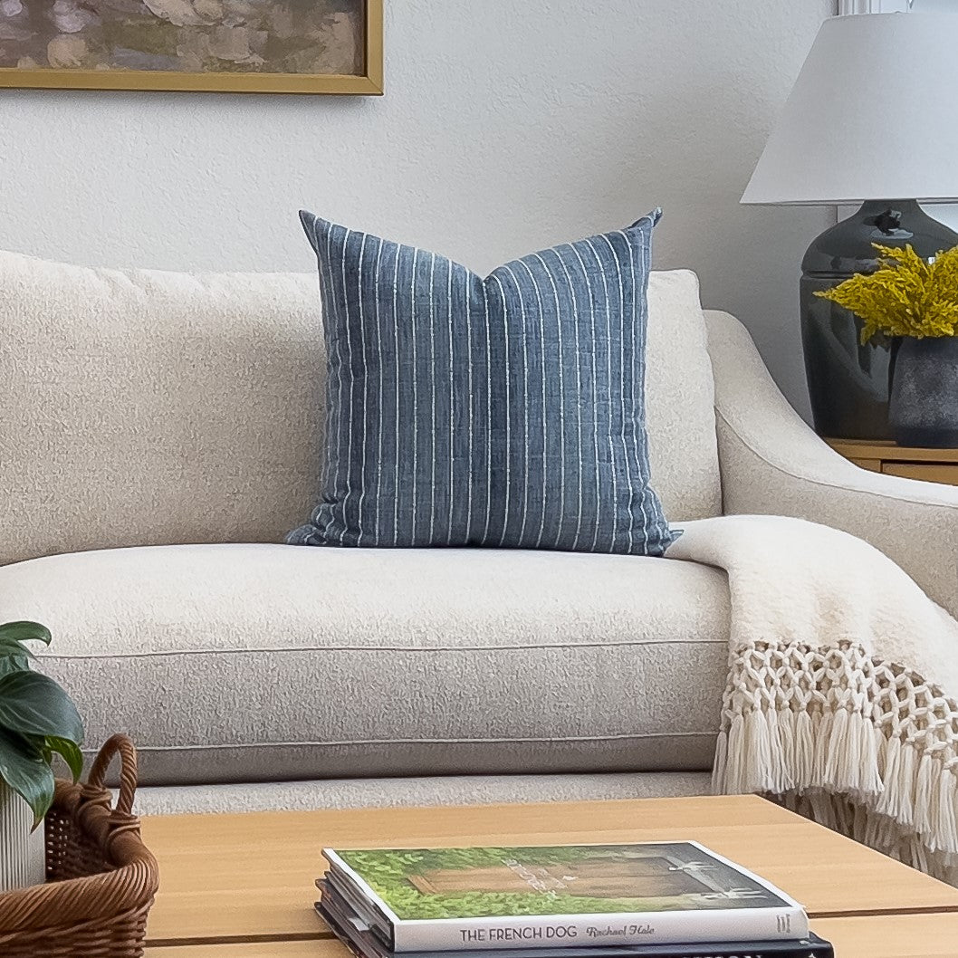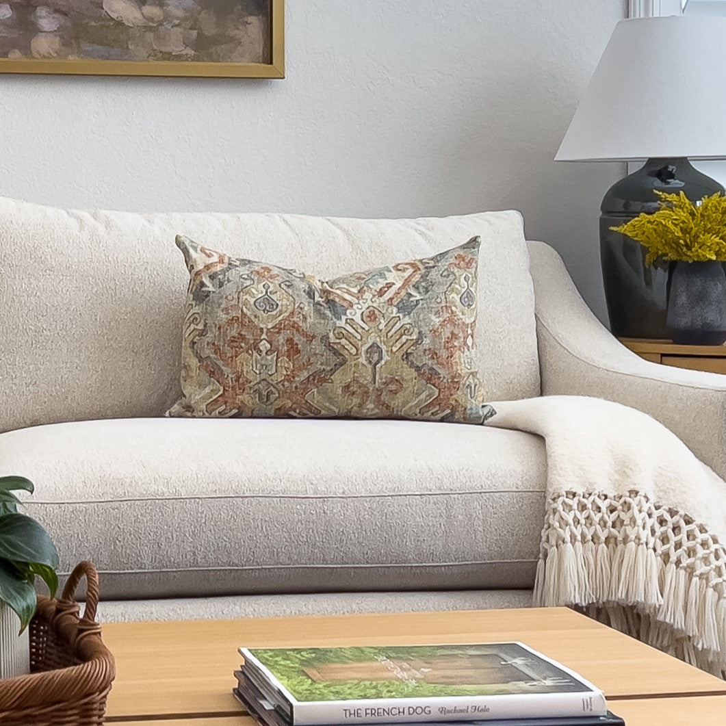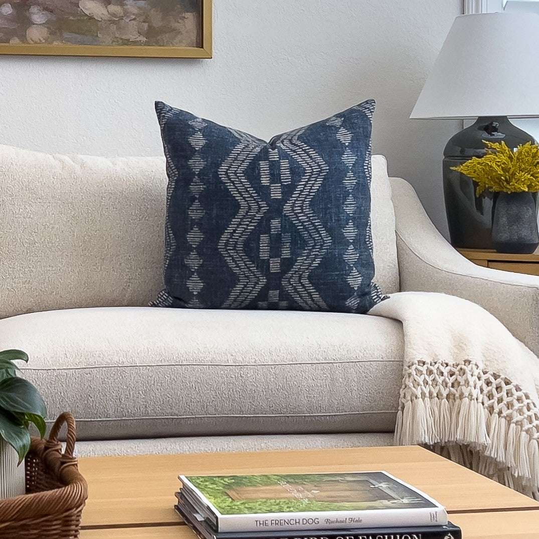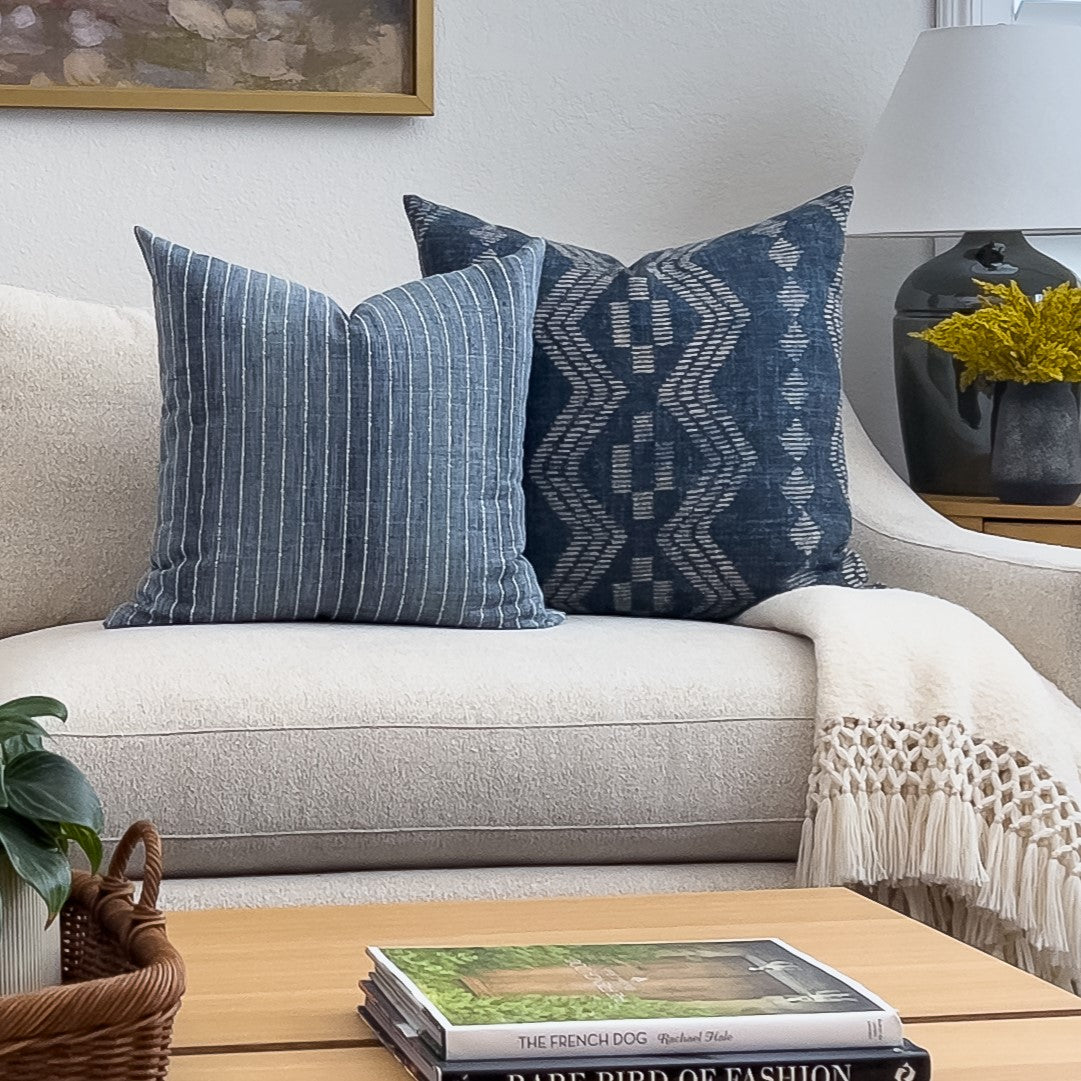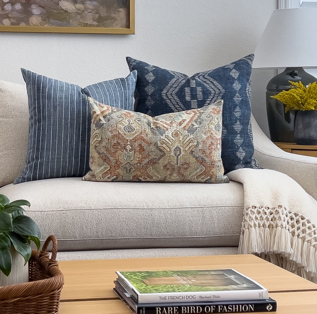 Bundle and save on this eclectic mix of patterned pillows. The distressed denim and blue ombre pillows layer beautifully with the warm terracotta, cool shades of blue and gray and soft neutrals in the stunning Kilim-inspired printed pillow at the forefront