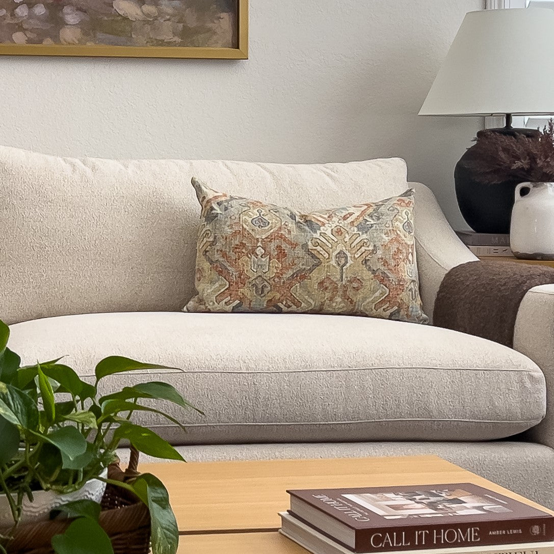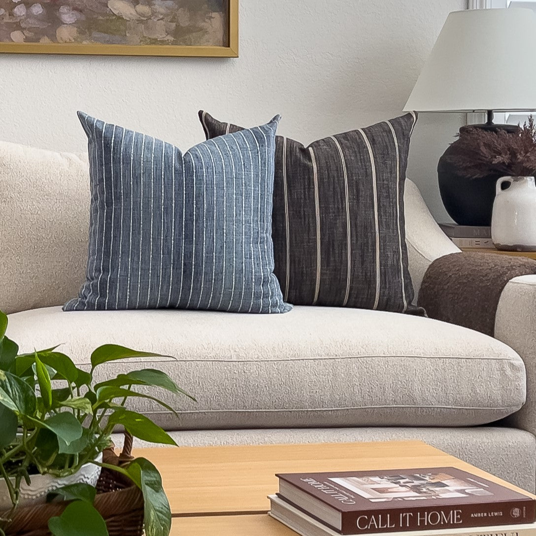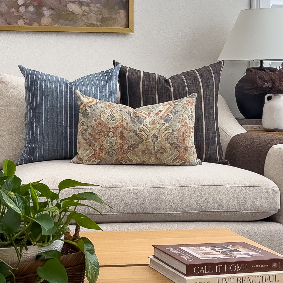 Bundle and save on this eclectic mix of patterned pillows. The distressed black and blue ombre pillows layer beautifully with the warm terracotta, cool shades of blue and gray and soft neutrals in the more complex, Kilim-inspired printed pillow at the forefront.