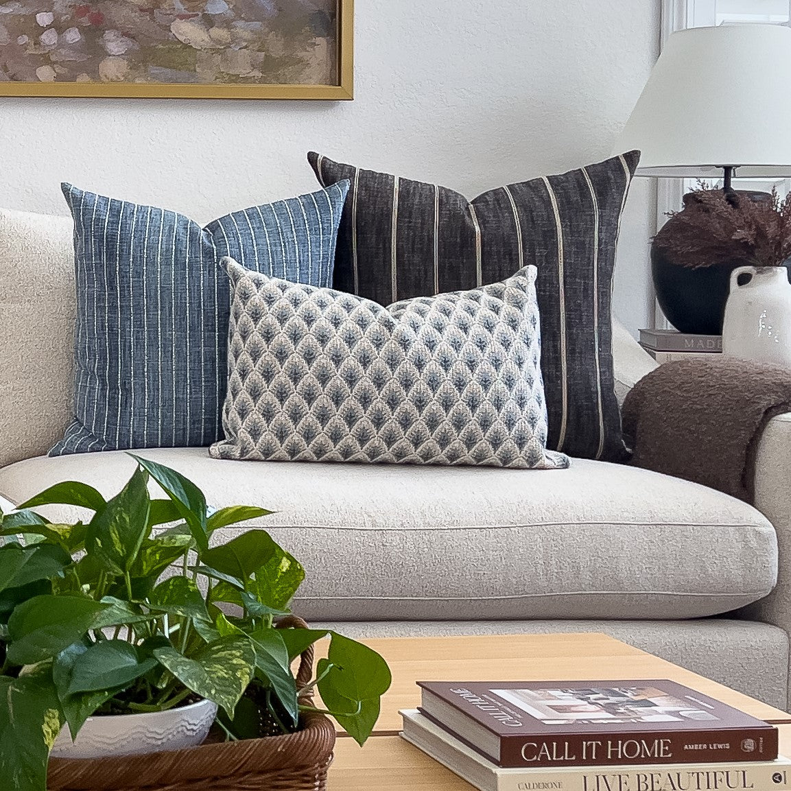 Bundle and save on this eclectic mix of patterned pillows. The distressed black and blue ombre pillows layer beautifully with the warm terracotta, cool shades of blue and gray and soft neutrals in the more complex, Kilim-inspired printed pillow at the forefront.