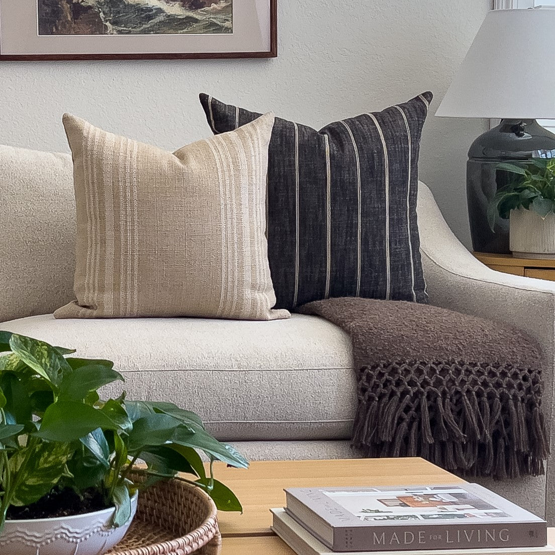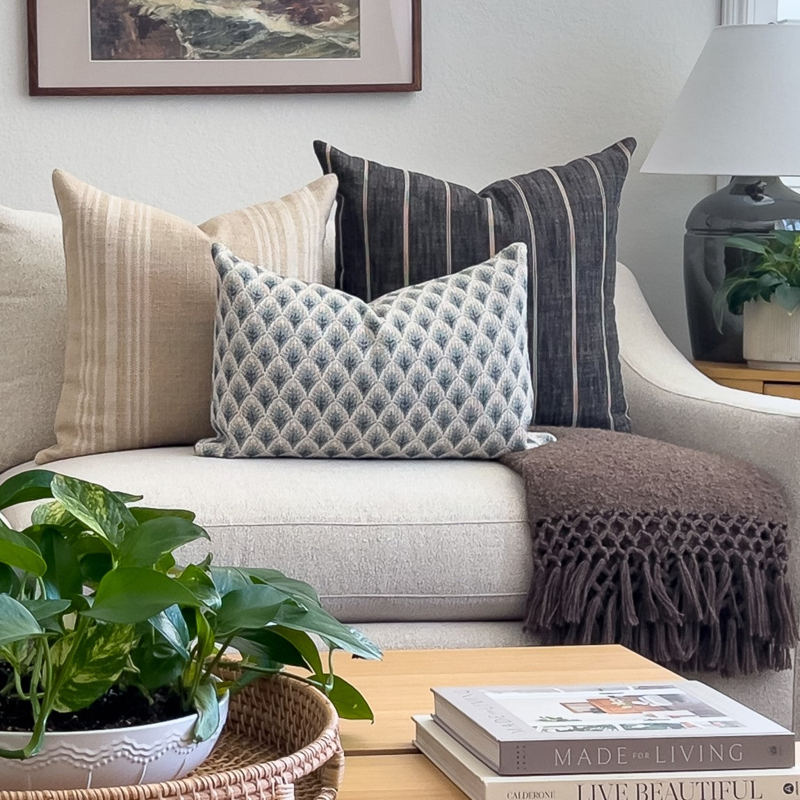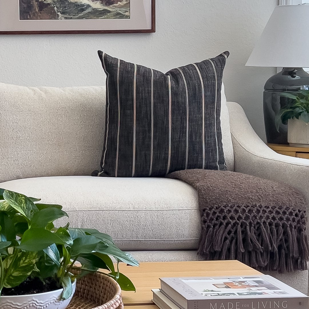 Bundle and SAVE 10% on this eclectic mix of patterned pillows. The distressed black and natural linen stripes are the perfect foundation to lay with the richly woven deco-inspired design at the forefront.