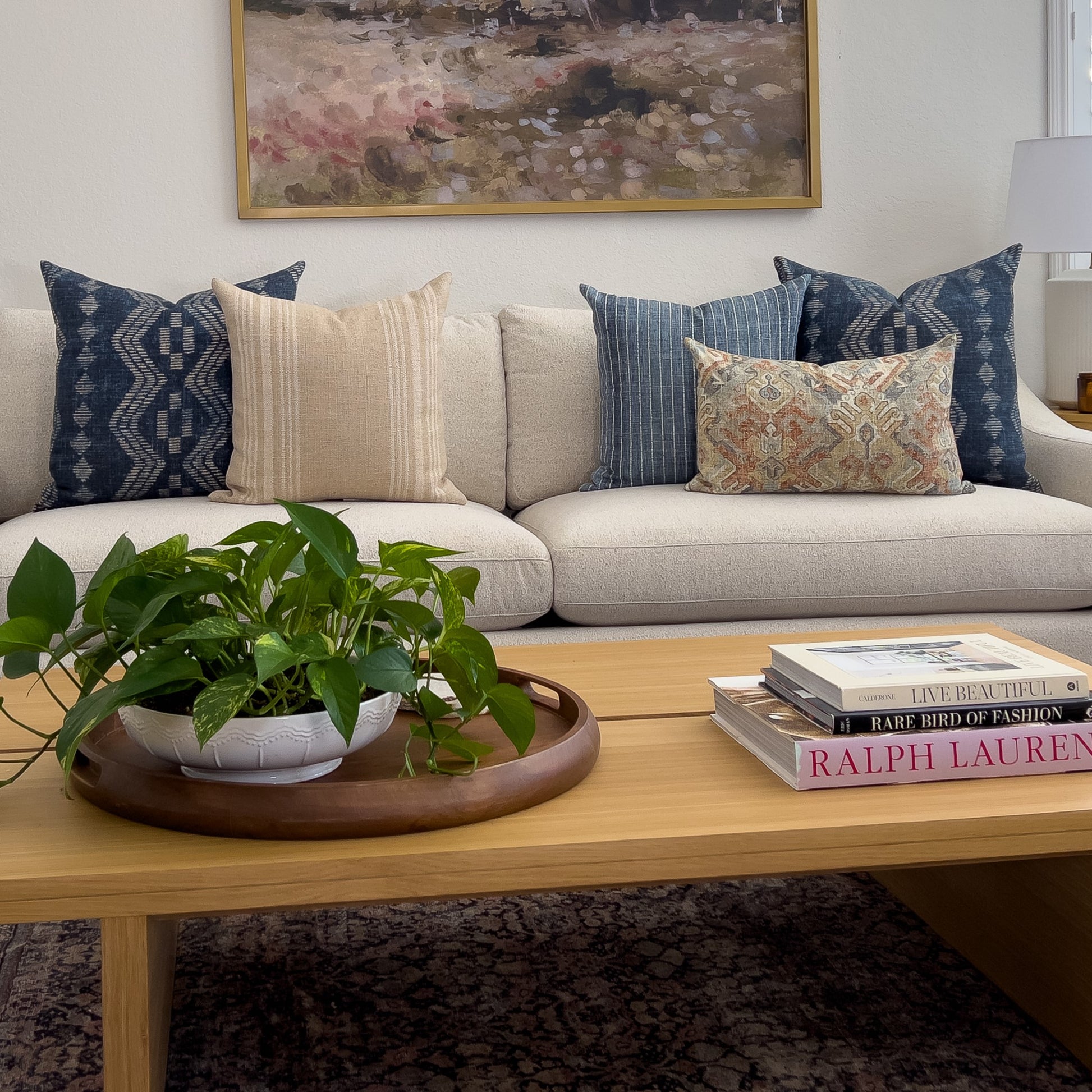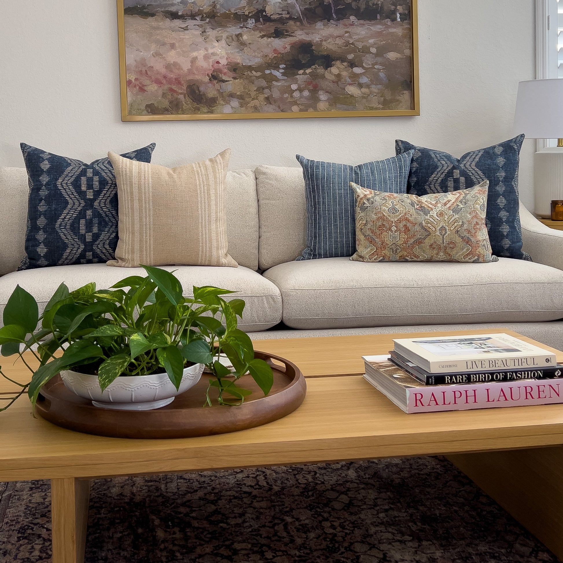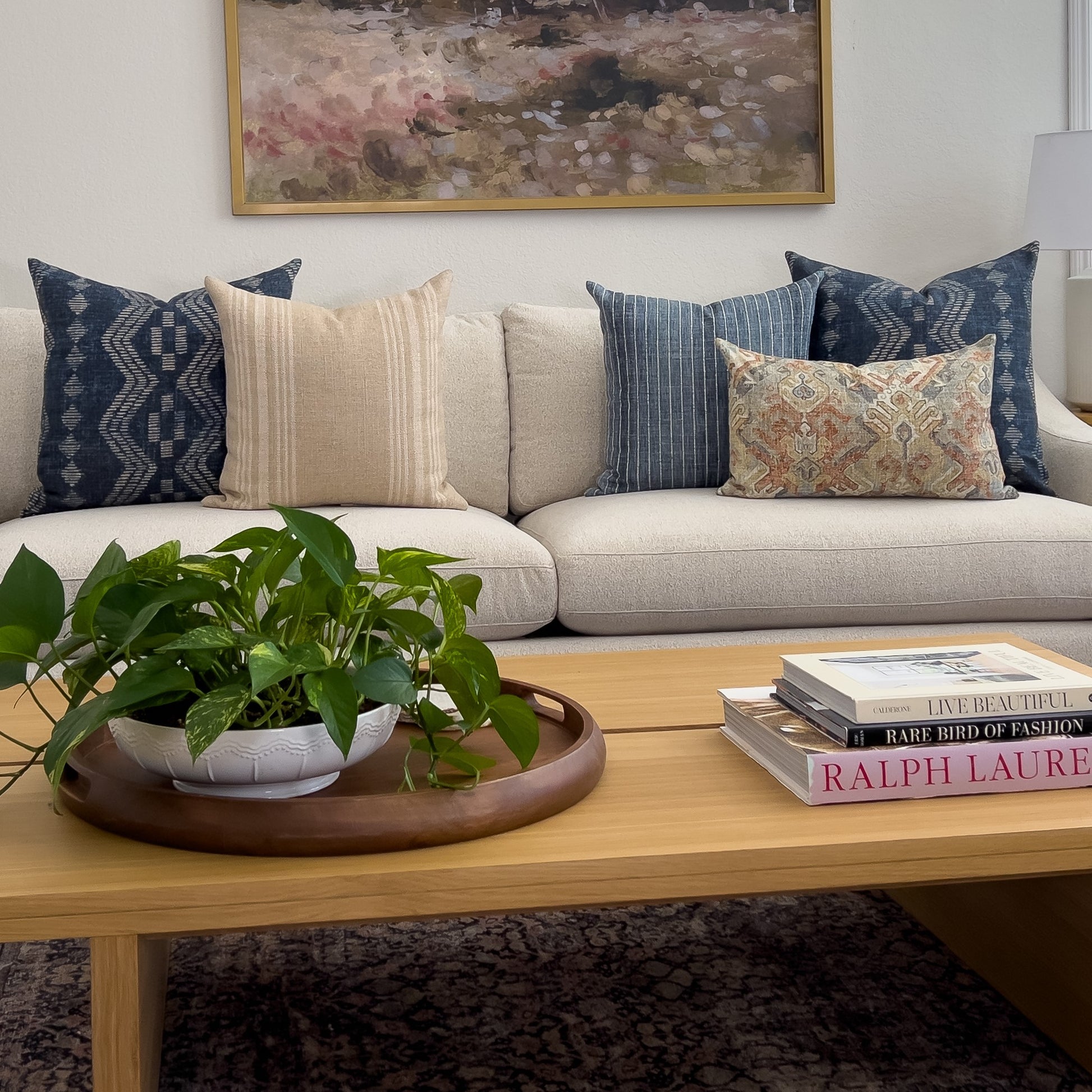 Bundle and save 10% on this eclectic mix of patterned pillows. Distressed denim and blue ombre pillows layer beautifully with the warm terracotta, cool shades of blue and gray, and soft neutrals in the stunning Kilim-inspired print at the forefront.