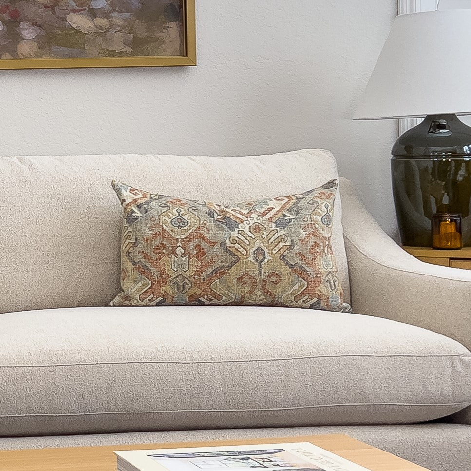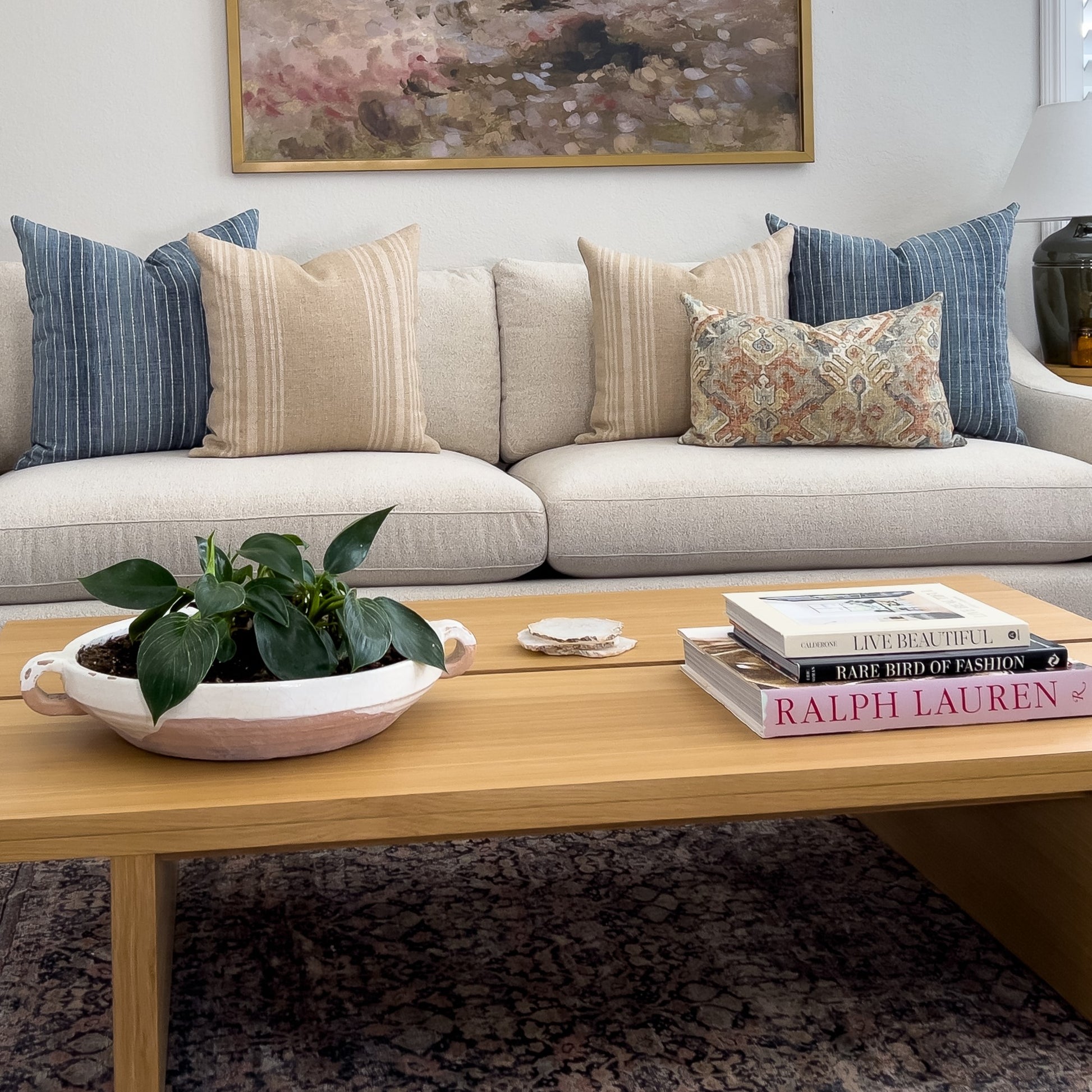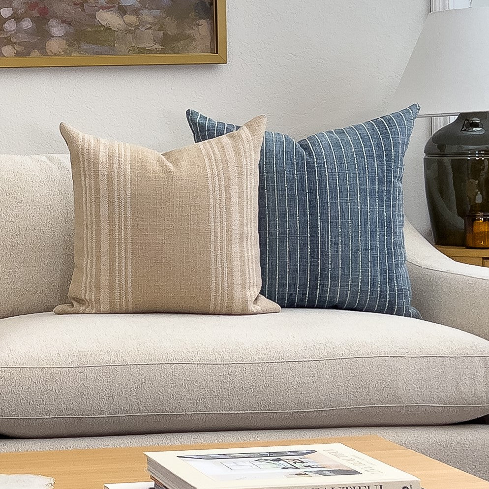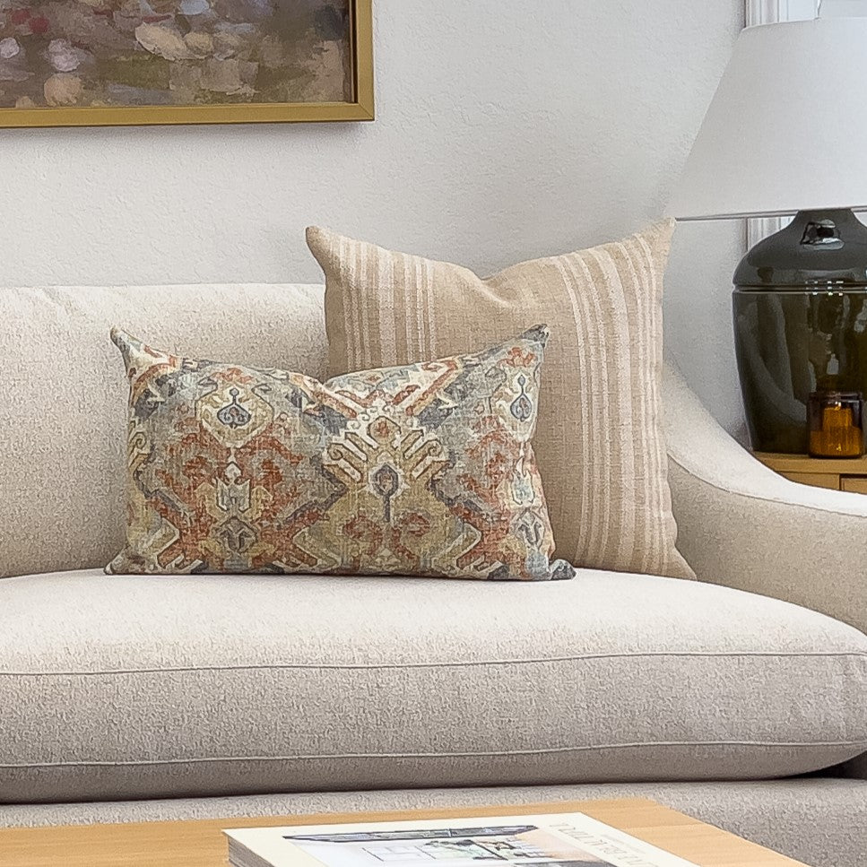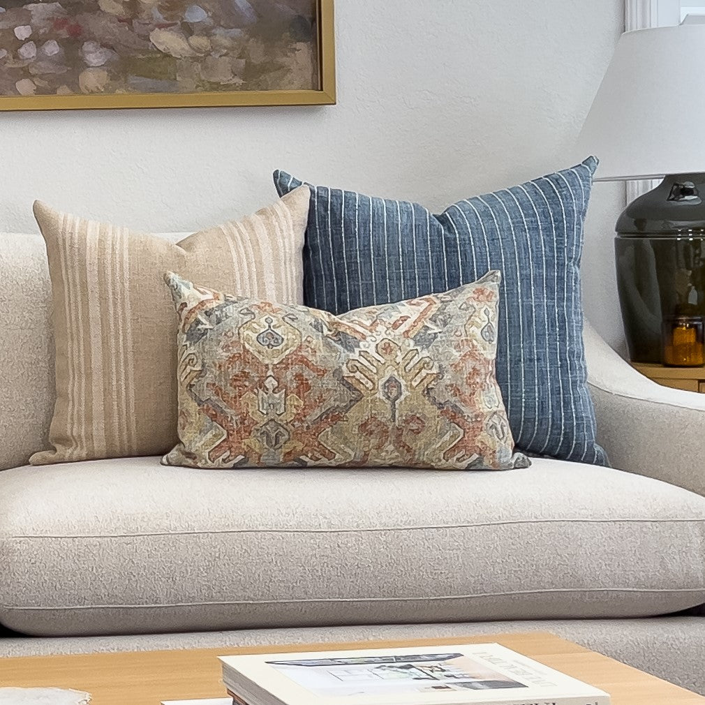 Bundle and save 10% on this specially curated 5-piece pillow collection. Shades of blue and natural linen in the striped pillows provide the perfect foundation to layer with the warm and cool colors in the multi-colored Kilim print at the forefront.