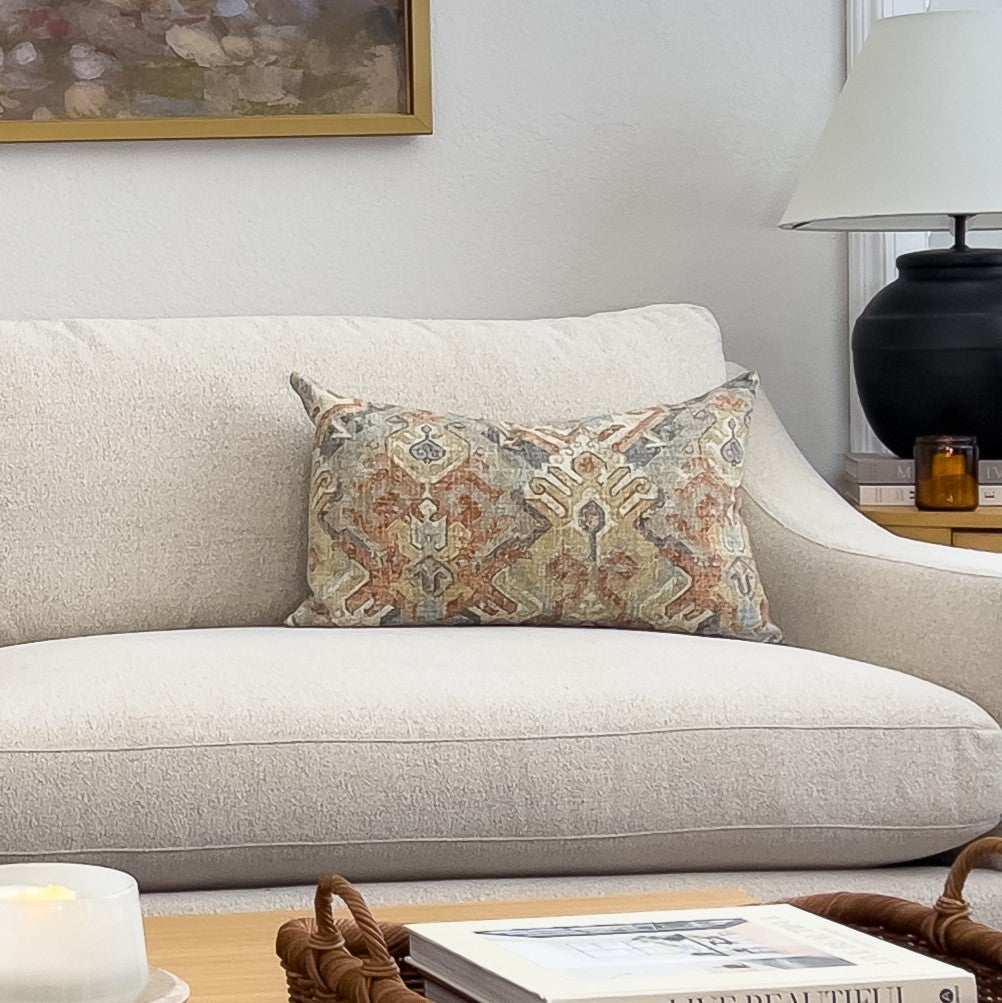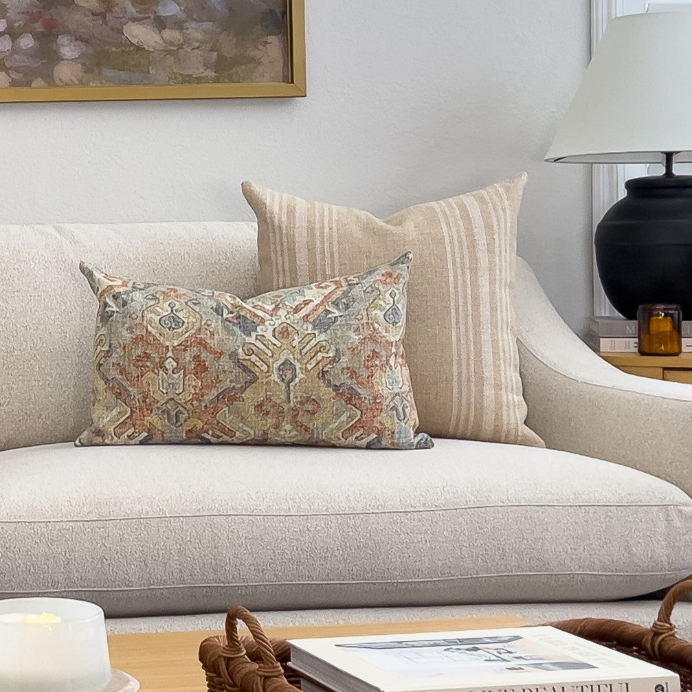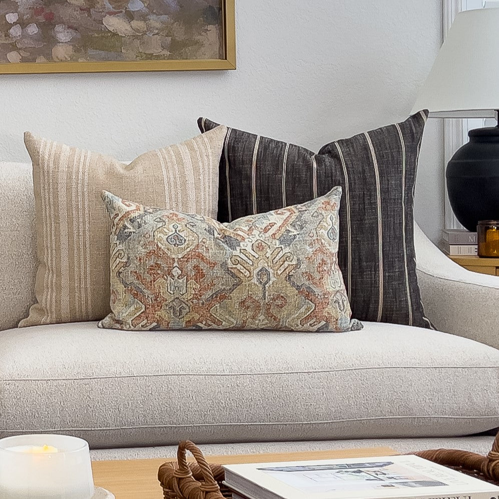 Bundle and save 10% on this specially curated 5-piece pillow collection. Shades of blue and natural linen in the striped pillows provide the perfect foundation to layer with the warm and cool colors in the multi-colored Kilim print at the forefront.