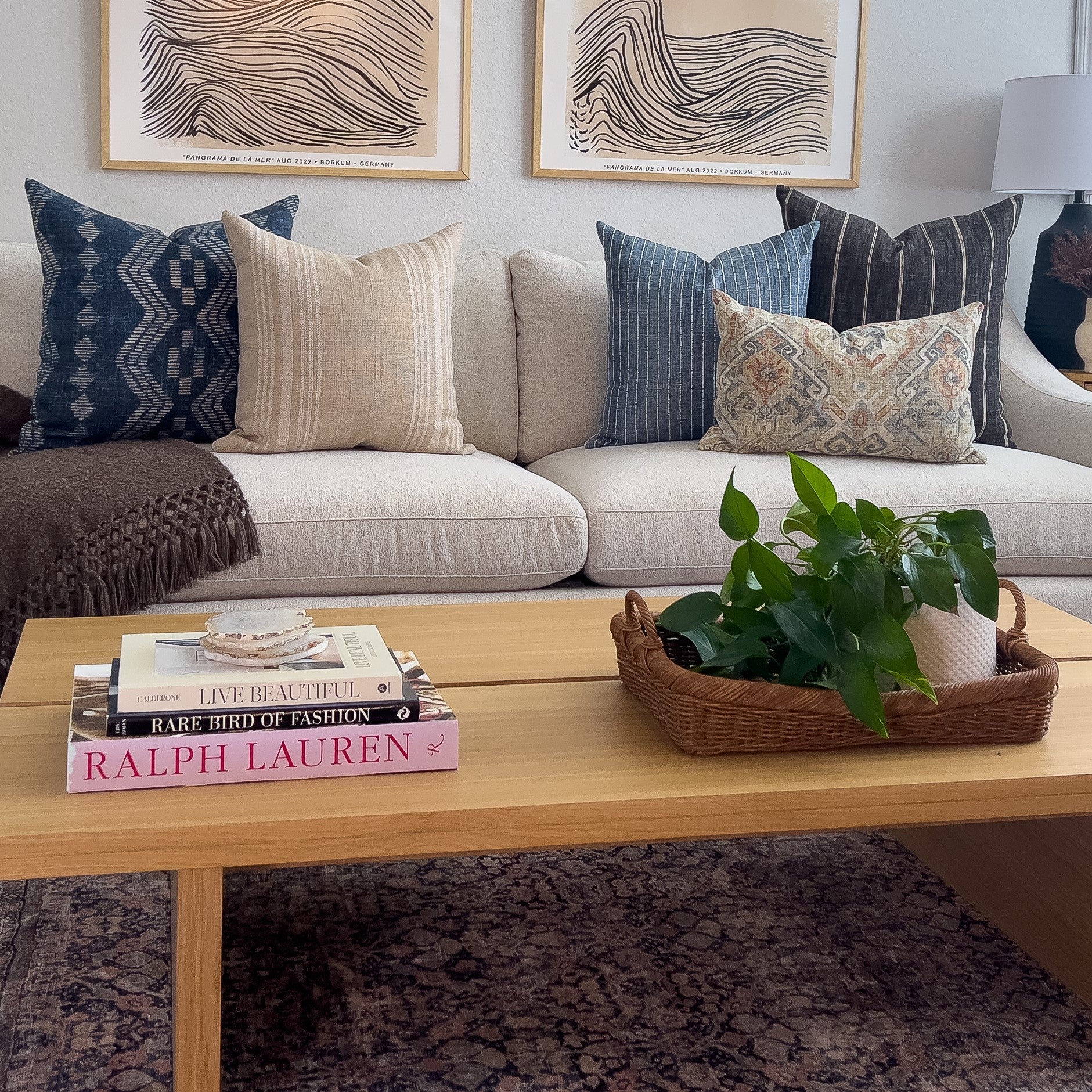 Bundle and save 10% on this eclectic 5-piece pillow collection. If "matchy-matchy" pillow combinations aren't your thing, this coordinated collection might be the perfect solution. Distressed black, shades of blue, and natural linen in the striped pillows layer effortlessly with the warm and cool colors in the multi-colored Kilim print at the forefront.