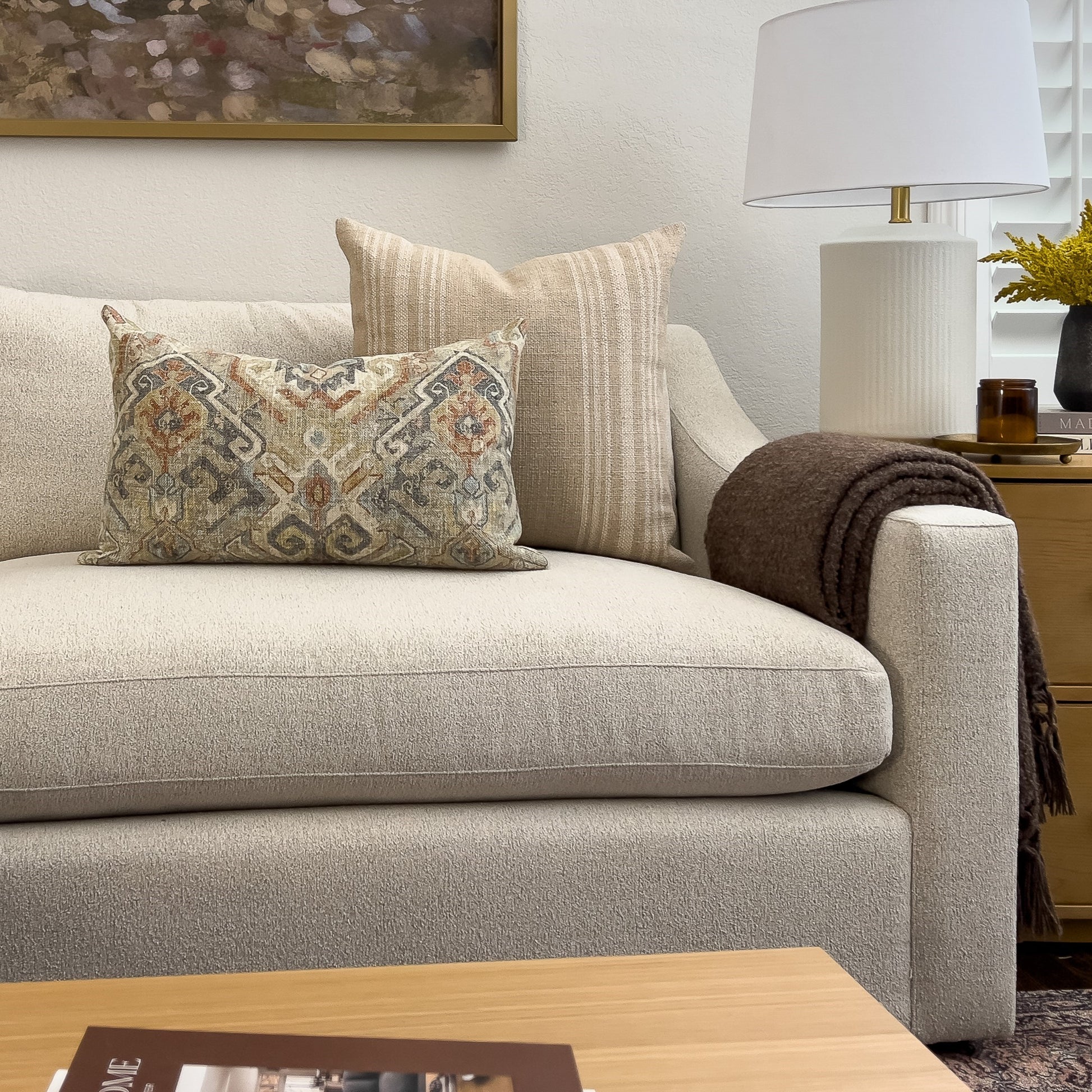 Inspired by traditional kilim designs, warm terracotta, cool shades of blue and gray and soft neutrals are printed with subtle distressing on a textural cotton/linen fabric. Strong enough to lead a well-curated pillow collection, this design is also soft enough to layer effortlessly with other patterns. Shown in 14x22" on sofa and in 16x26" on bed.