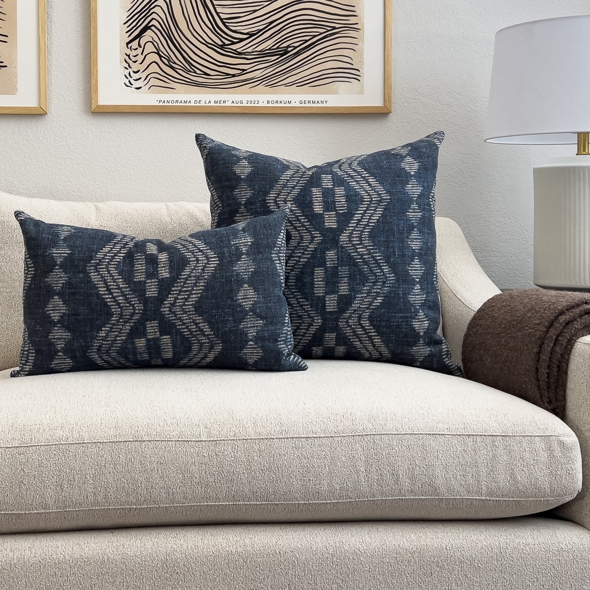 Inspired by the way rivers carve their way through canyon walls, this unique design is printed in a distressed denim color on a textured cotton/linen fabric. The deep, saturated color takes on a rich artisanal quality which is perfect for layering with striped and patterned pillows in lighter colors. Shown in a 20"x20" square and a 14x22" lumbar on the sofas; shown in a 16x26" lumbar on bed.